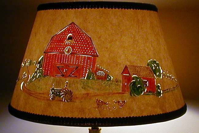 Below you see a closer view of the lampshade with the light on. The painted barn scene is visible.